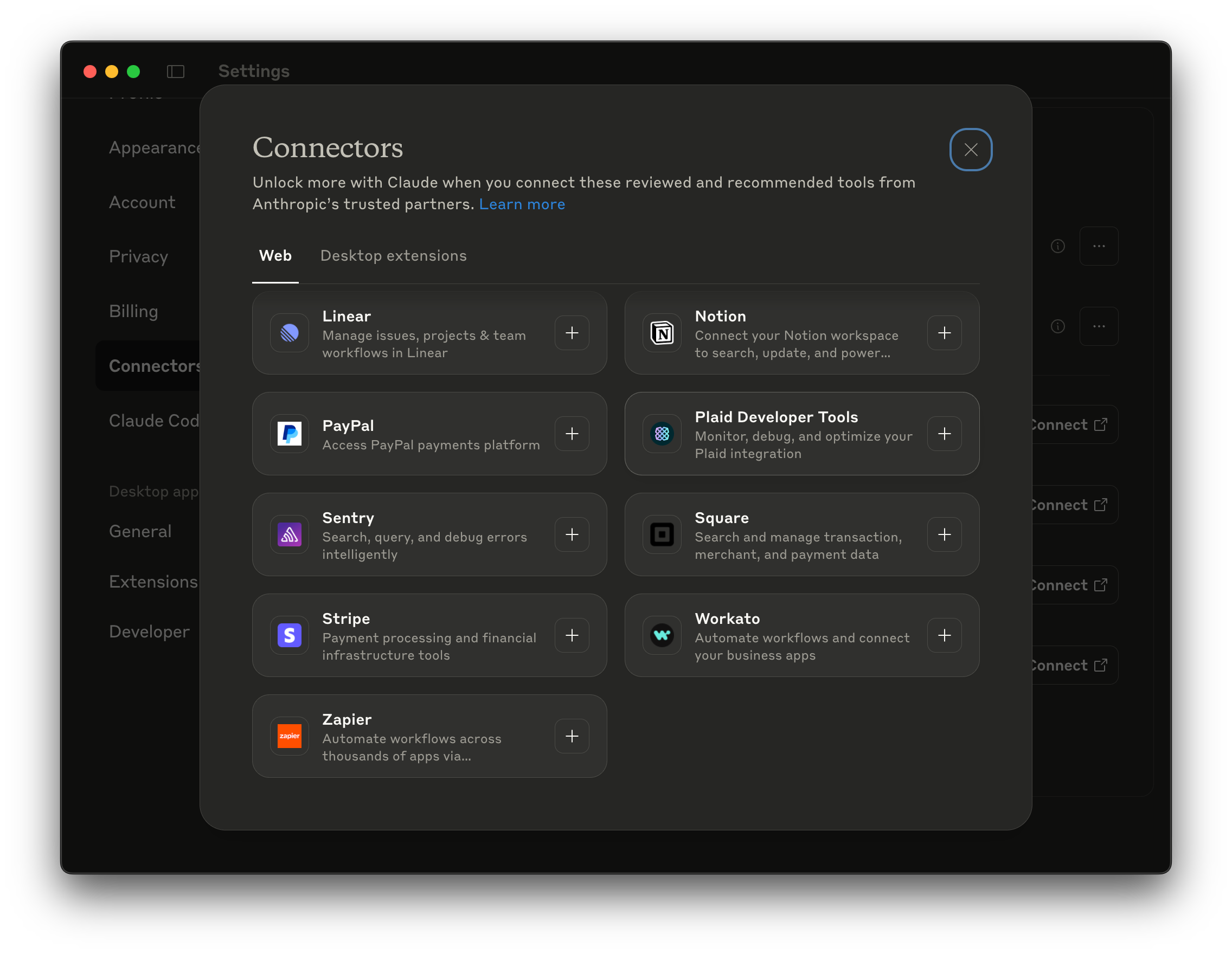 In Claude, MCPs live under Settings > Connectors. You’ll see Web and Desktop extensions. I built a desktop extension that behaves like a web connector.