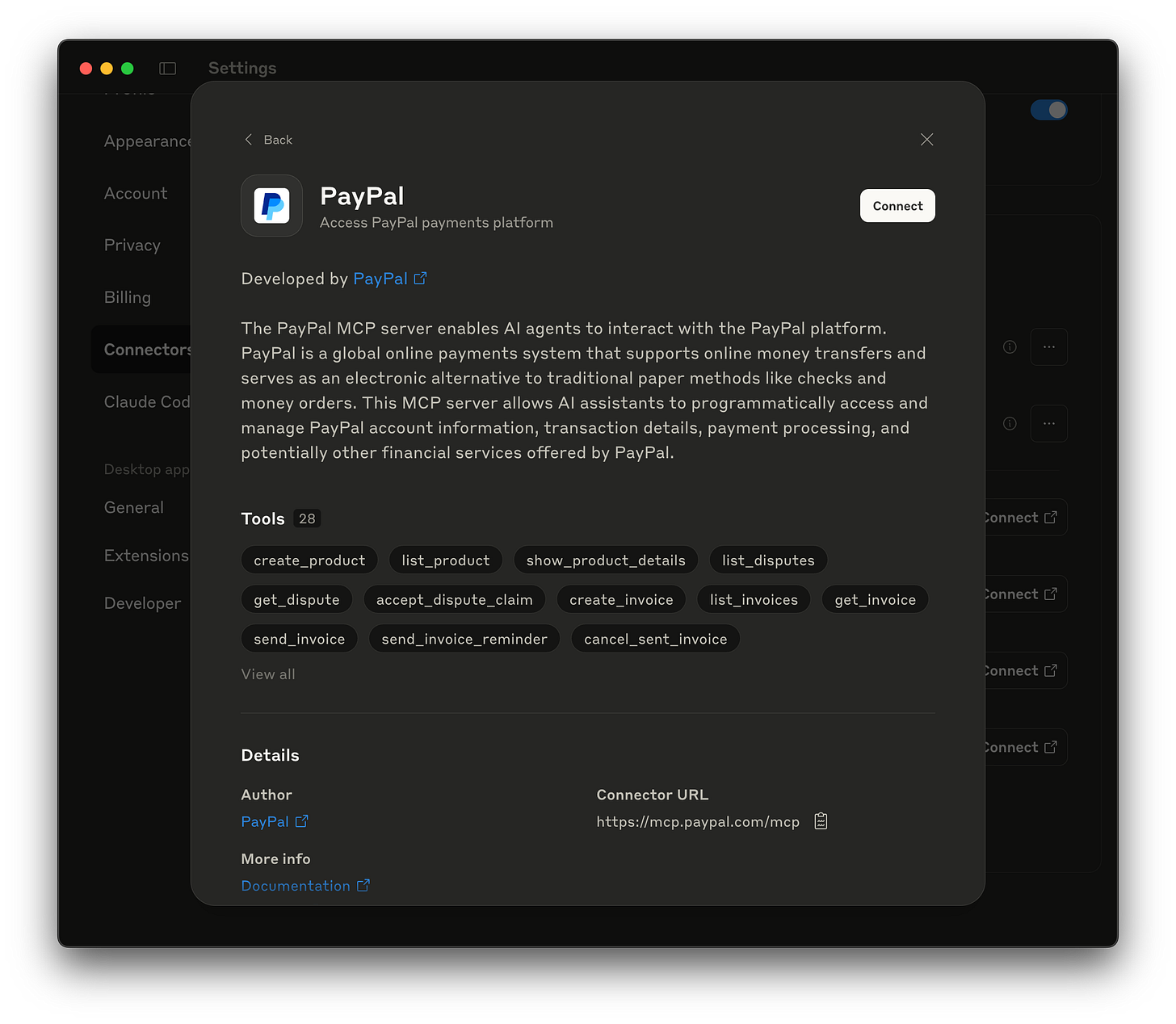 If Wio created an official MCP, you’d just click their connector. No setup. Just like this PayPal example, there will be a page similar to an app store page where you can learn about the mcp functionalities.